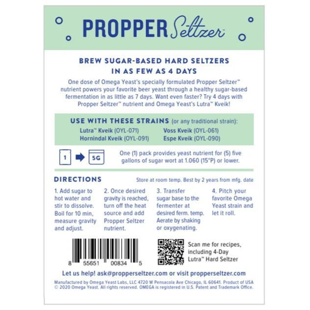 One dose of Omega Yeast’s specially formulated gluten-free Propper Seltzer™ nutrient powers your favorite beer yeast through a healthy sugar-based fermentation in as little as 7 days. Want even faster? Try 4 days with Propper Seltzer™ nutrient and Omega Yeast’s Lutra™ Kveik! Depending on yeast selection and fermentation temperature, fermentation can take anywhere between 2-7 days. For the fastest results, ferment with Omega Yeast’s kveik strains at high temps (80-96°).